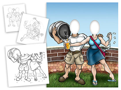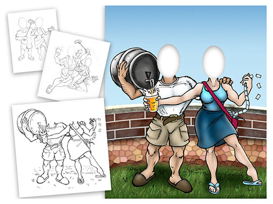 I submitted a couple of ideas (to the left in pencil), then inked in the winner. I did the coloring in Photoshop.