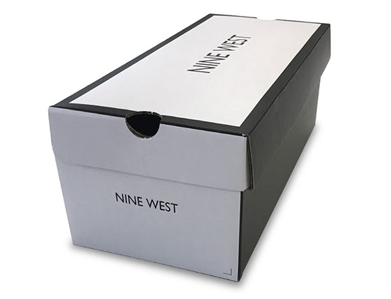 The box is a single piece of corrugate, with a heavy CCNB topsheet to cover up the corrugation. It is coated with a flood gloss UV, in keeping with Nine West’s branding standards.