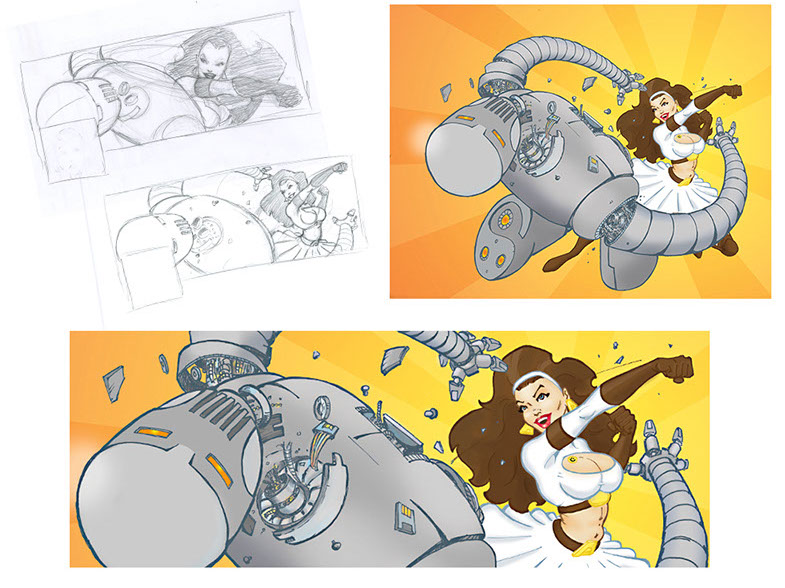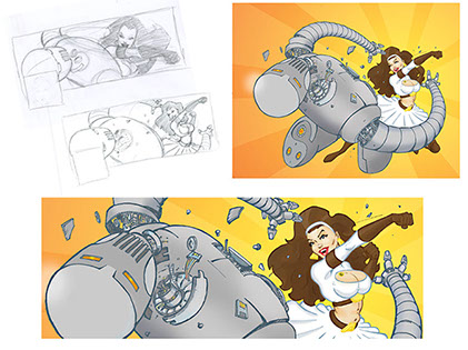 I submitted a couple of ideas (to the left in pencil), then inked in the winner. I did the coloring in Photoshop.